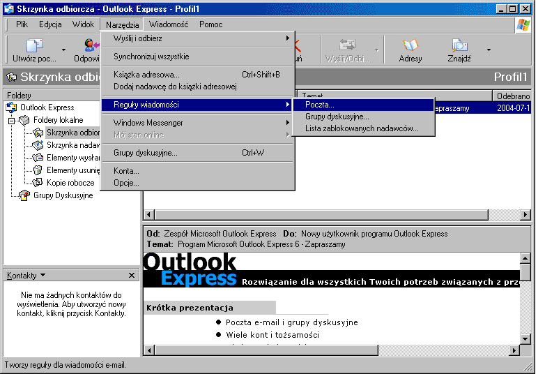 1. Wybieramy kolejno : Narzędzia - Reguły Wiadomości - Poczta zobacz