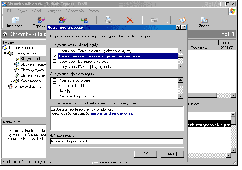 2. Zaznaczamy "Kiedy w treści wiadomości znajdują się określone wyrazy" zobacz