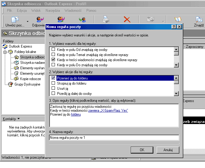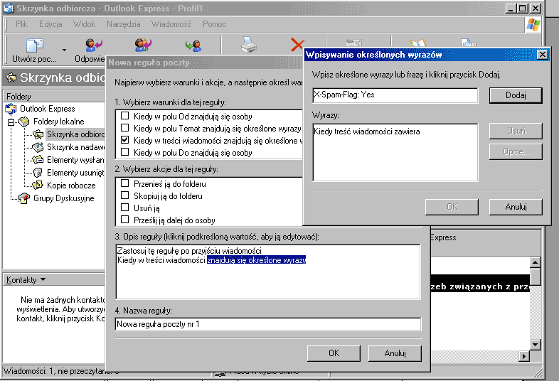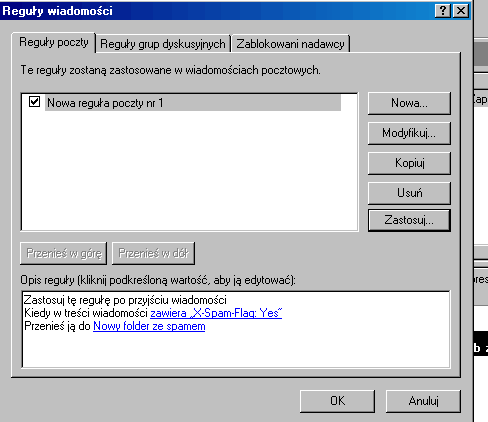 Poniżej przedstawiamy konfigurację Filtru Antyspamowego w programie pocztowym: Outlook Express.